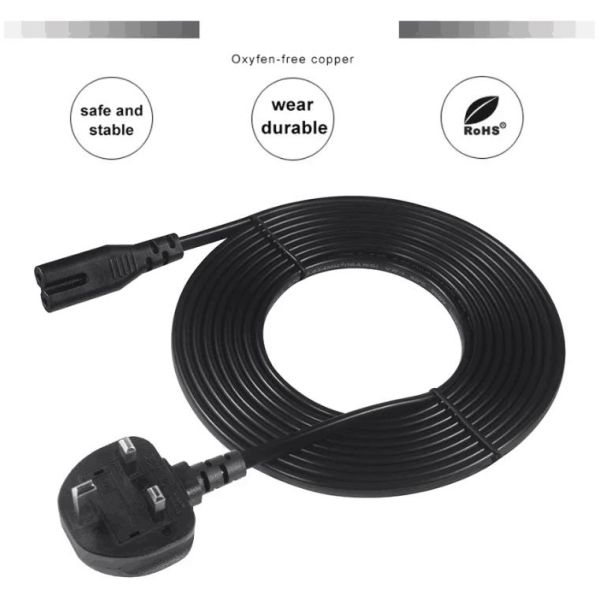 British Bs 3 Prong Plug AC Power Cords IEC Mains Lead Cable 5Ft 1.5M UK to C7 Figure 8 Cable
